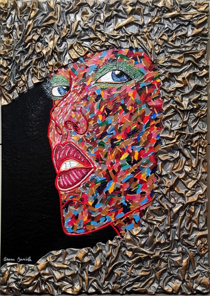 Dettagli materici: Pasta modellante e tecnica mista arricchiscono la superficie, conferendo profondità e rilievo. Lo sfondo, astratto e dinamico, esalta la protagonista, suggerendo movimento e vitalità.