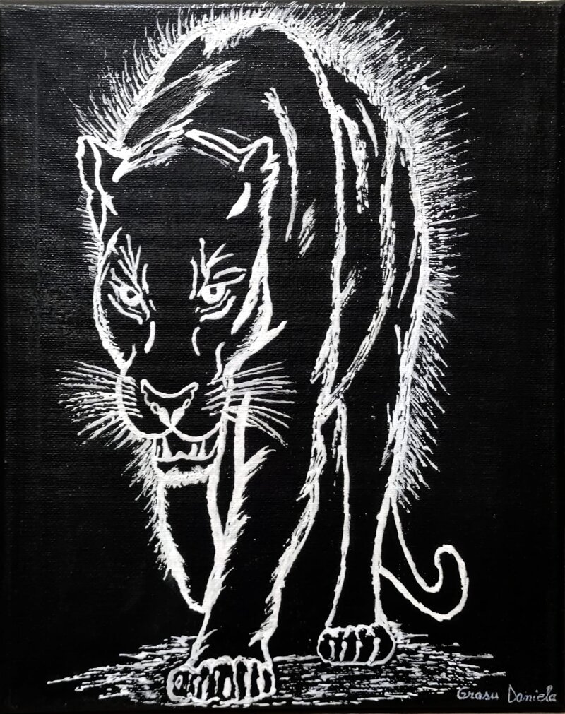 Questa opera si distingue per il suo stile grafico e monocromatico: la tela nera viene animata da un disegno realizzato a pennello con acrilico bianco. Le linee essenziali e decise costruiscono l’immagine di una puma che avanza verso lo spettatore, mettendo in risalto la forza e il dinamismo dell’animale. Il contrasto fra fondo scuro e tratti luminosi rende la composizione immediata e potente.