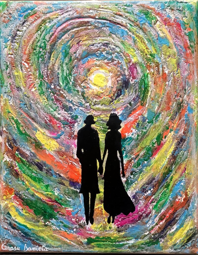La tela è realizzata con colori acrilici materici, stesi a spatola e pennello per costruire vortici concentrici e multicolori che partono dal centro e si espandono verso i bordi. La superficie presenta spessori e texture evidenti, ottenuti con abbondante colore per enfatizzare il senso di movimento e profondità. Al centro, in controluce, spiccano le silhouette nere di due figure mano nella mano, realizzate con una pittura piatta e contrastante rispetto allo sfondo dinamico.