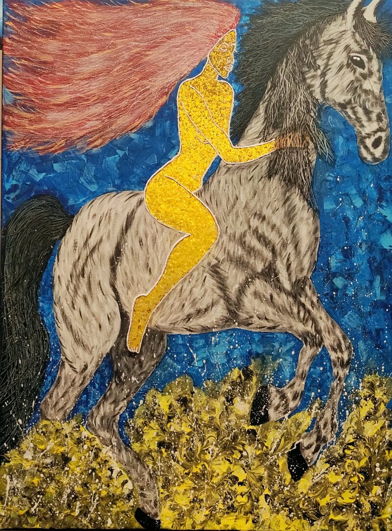 L’opera è realizzata su tela con colori acrilici e inserti glitter dorati. La figura femminile è sagomata e riempita con pigmenti oro e glitter che ne accentuano la luminosità. La chioma rossa è ottenuta tramite pennellate energiche e stratificate, il cavallo è dipinto con sfumature e segni materici che evocano il movimento e la forza, e il paesaggio si apre su un fondo blu acceso e una base ricca di texture gialle, realizzate con spatola e pennello