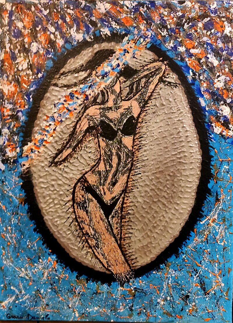 Questa figura femminile rappresenta la libertà del corpo e dello spirito. La posa audace, protetta da un evidente ovale, richiama la forza di affermare sé stessi anche nel mezzo del caos. Gli schizzi di colore all’esterno suggeriscono la vitalità, la passione e l’intensità emotiva che circondano la donna, ma che non riescono a intaccare la sua centralità e identità. L’opera esprime il desiderio di emancipazione dalle convenzioni e invita lo spettatore a celebrare la propria unicità e forza interiore.