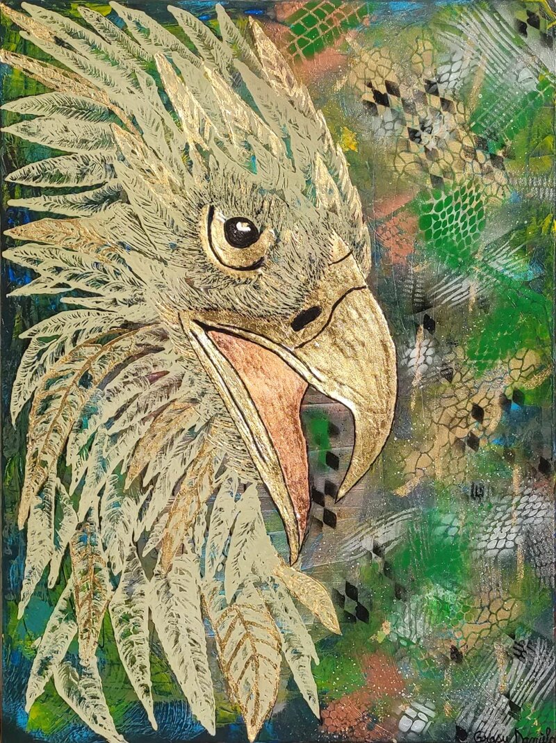 Il protagonista dell’opera è un grande rapace, fiero e concentrato. L’occhio lucido e deciso cattura immediatamente l’attenzione, mentre il piumaggio materico si apre in una composizione dinamica e luminosa, esaltata dall’oro e dall’argento che conferiscono potenza e sacralità. Il becco affilato spicca come simbolo di determinazione. Sullo sfondo, pattern astratti e cromie naturali suggeriscono l’habitat selvaggio, donando ampiezza e respiro all’insieme. La composizione trasmette energia vitale, eleganza e un senso di profonda libertà.