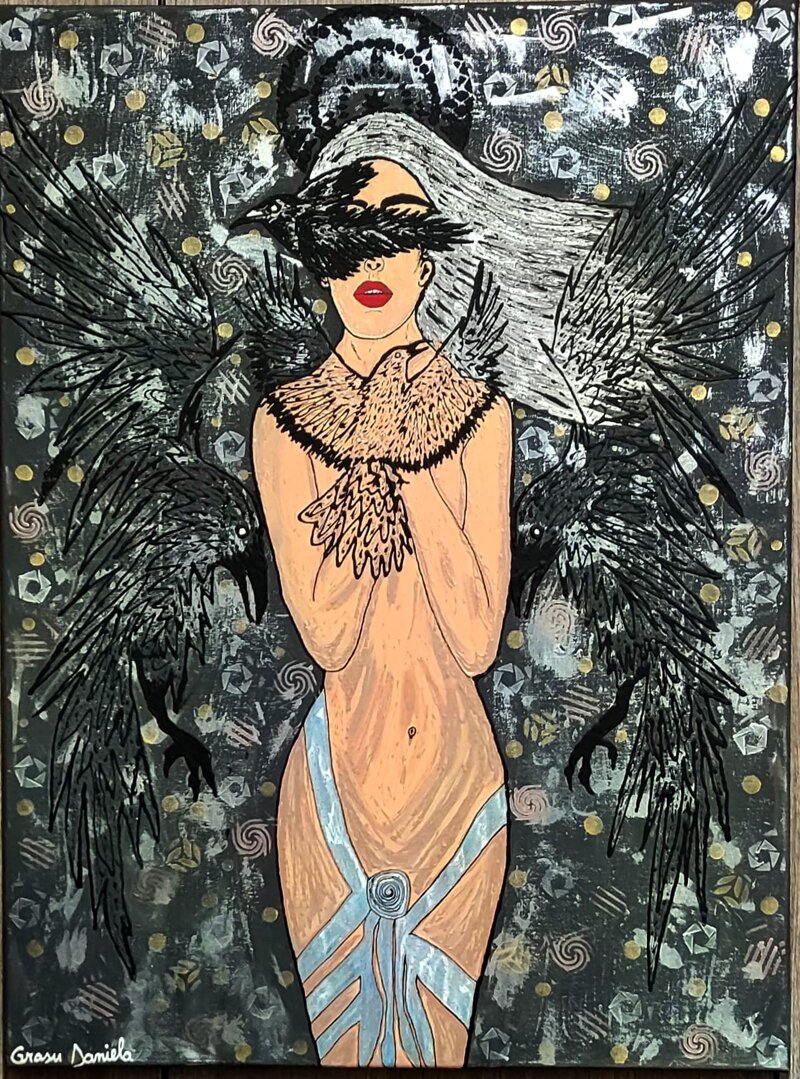 La nudità non è esibita in chiave erotica ma come condizione di verità: il corpo è esposto e fragile, mentre la corona di piume e la presenza dei corvi le conferiscono autorità e protezione. Il contrasto tra la bocca rossa, viva e sensuale, e il volto parzialmente nascosto parla di una femminilità che sceglie quando mostrarsi e quando restare enigma. L’opera, nel suo insieme, riflette sul potere di accogliere la propria parte oscura e di trasformarla in forza regale, facendo dei corvi non un presagio di sventura, ma alleati e guardiani interiori.