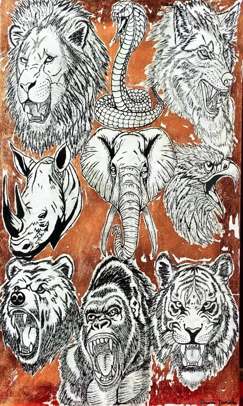 Opera realizzata con tecnica mista su supporto rigido/tela: fondo lavorato con acrilici e pigmenti metallici tono rame, stesi a più strati e parzialmente abrasi per creare effetti di luce e usura. Le teste degli animali sono disegnate a inchiostro/liner nero su base chiara, con un tratto incisivo e fitto di segni per definire pelo, piume e texture, e successivi passaggi di bianco coprente per staccare le figure dal fondo. I contorni sono netti, quasi da incisione o tatuaggio, per dare un carattere totemico e grafico all’insieme.