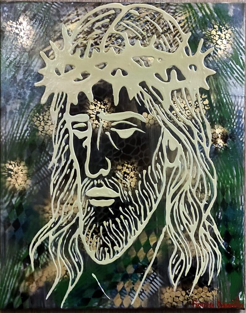 Opera realizzata con tecnica mista su supporto rigido/tela: fondo ottenuto con acrilici sovrapposti, velature, spatolate e possibili interventi di alcool ink o medium per creare effetti cellulari e riflessi metallici. Il volto di Cristo e la corona di spine sono eseguiti a rilievo con colore acrilico denso/medium materico applicato a pennello o beccuccio, generando un segno grafico continuo che si stacca nettamente dal fondo astratto.