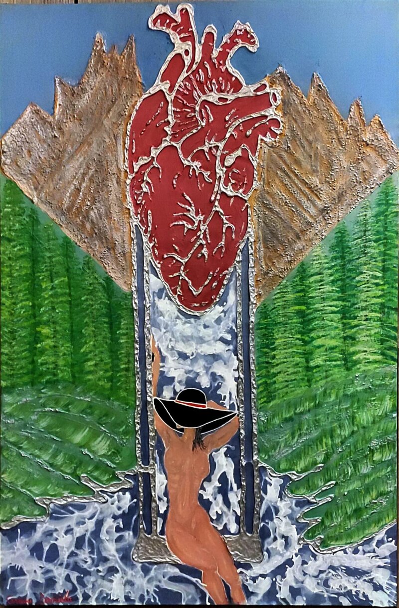 L’opera rappresenta il cuore come sorgente inesauribile da cui scaturiscono emozioni e desiderio: la cascata che scende dal cuore diventa un fiume in cui la donna si lascia trasportare, nuda e libera, simbolo di abbandono fiducioso alla propria energia interiore.