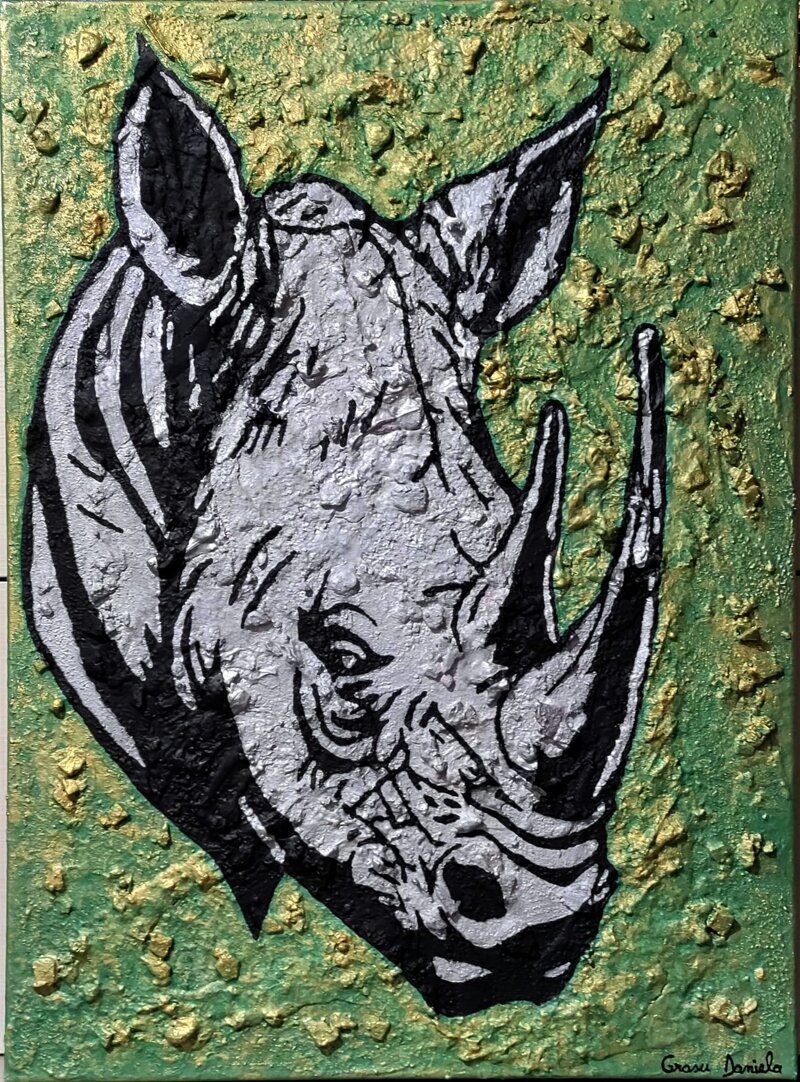 Realizzata con acrilici materici, spatola per effetti tridimensionali, foglia dorata e pasta modellante sul fondo verde per simulare savana aspra. La testa del rinoceronte è definita da contorni netti, campiture piatte e graffiature superficiali, tipiche delle tecniche miste usate dall'artista per opere su tela di queste dimensioni.