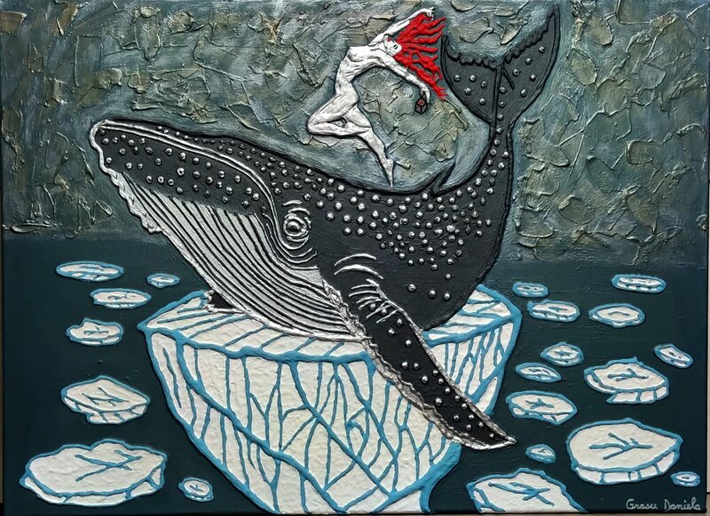 Opera materica su tela, dimensioni 55x75 cm, firmata "Daniela" in basso a destra. La composizione centrale raffigura una balena stilizzata in bianco e nero con striature marcate e dettagli puntinati, che emerge da un iceberg frastagliato in toni di bianco e azzurro ghiaccio, circondato da frammenti di ghiaccio fluttuanti su sfondo marino scuro e texturizzato. Una figura femminile nuda con fluenti capelli rossi si libra in armonia sopra la balena, in posa dinamica di danza, resa con linee fluide e materia sovrapposta per un effetto scultoreo e tattile.