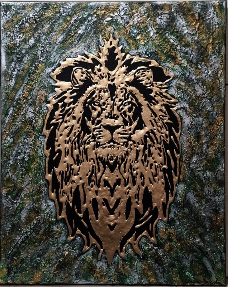 Sfondo: L'atmosfera intorno al leone è strutturata con texture molto materiche, ottenuta tramite stesura di pasta acrilica, spatolata e lavorata per dare profondità. I colori predominanti sono il verde, l'oro antico, l'argento e il nero, che sottolineano la maestosità e il mistero della “reggia” naturale del re.