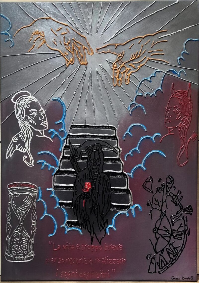 Tecniche usate: Acrilico su tela, pasta materica, rilievo a pigmenti metallici e colori acrilici, pennello fine per dettagli e scritte.