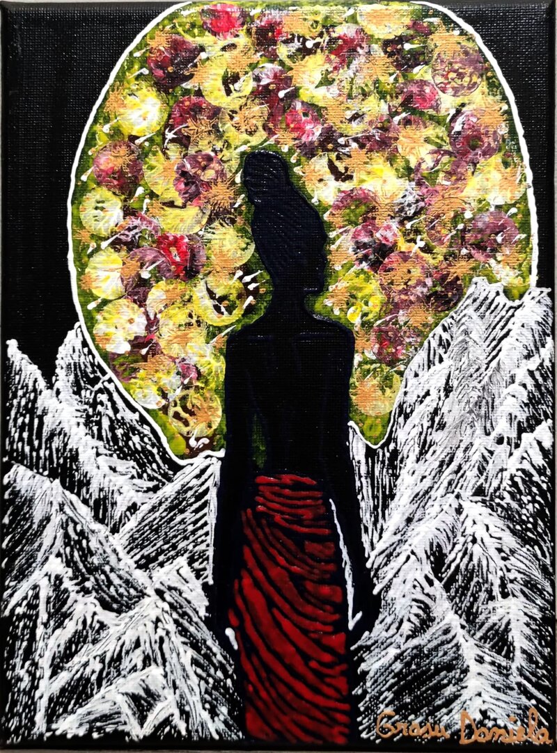 L’opera rappresenta la forza femminile e la connessione con la natura selvaggia africana. La figura si staglia tra montagne bianche stilizzate e la vegetazione rigogliosa racchiusa nel cerchio sovrastante, simboleggiando l’armonia tra energia interiore e paesaggio esterno. Il quadro invita a riconoscere la bellezza nei contrasti e a valorizzare la spiritualità e la vitalità che provengono dalla cultura e dalla terra