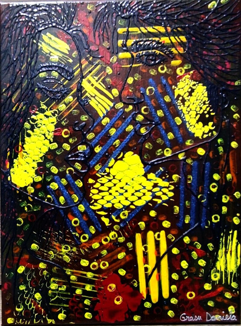 Questo quadro racconta l’intensità emotiva che nasce dall’incontro tra due persone. Le linee spezzate e i colori vibranti esprimono la complessità dei sentimenti e la connessione energetica che si crea tra gli innamorati. L’incastro visivo tra i volti suggerisce fusione, dialogo silenzioso e desiderio di vicinanza, mentre la sovrapposizione di colori e segni comunica la ricchezza di emozioni che accompagna l’amore.