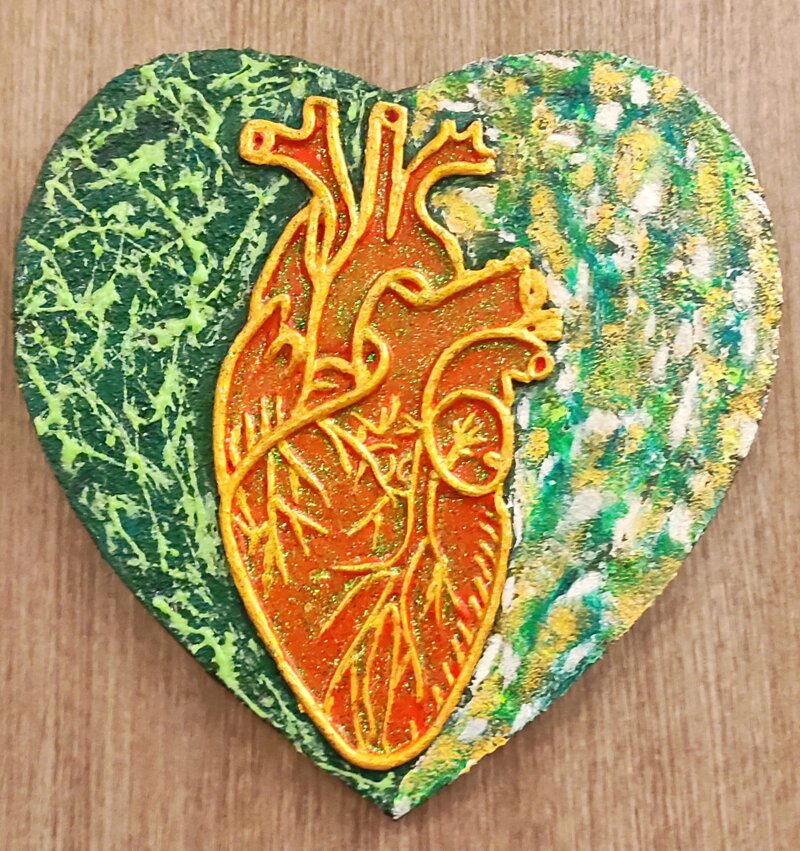 Questa opera tridimensionale nasce dall’unione di materiali argille e colori acrilici su supporto sagomato a forma di cuore. La base verde è realizzata con pennellate materiche e uso di spatola, con effetti marmorizzati e sovrapposizioni di giallo e bianco che simulano il folto della vegetazione. Al centro, il cuore anatomico rosso-oro emerge con rilievo, dettagliato da una luminescenza glitterata che lo rende protagonista assoluto e ne sottolinea la forza vitale.